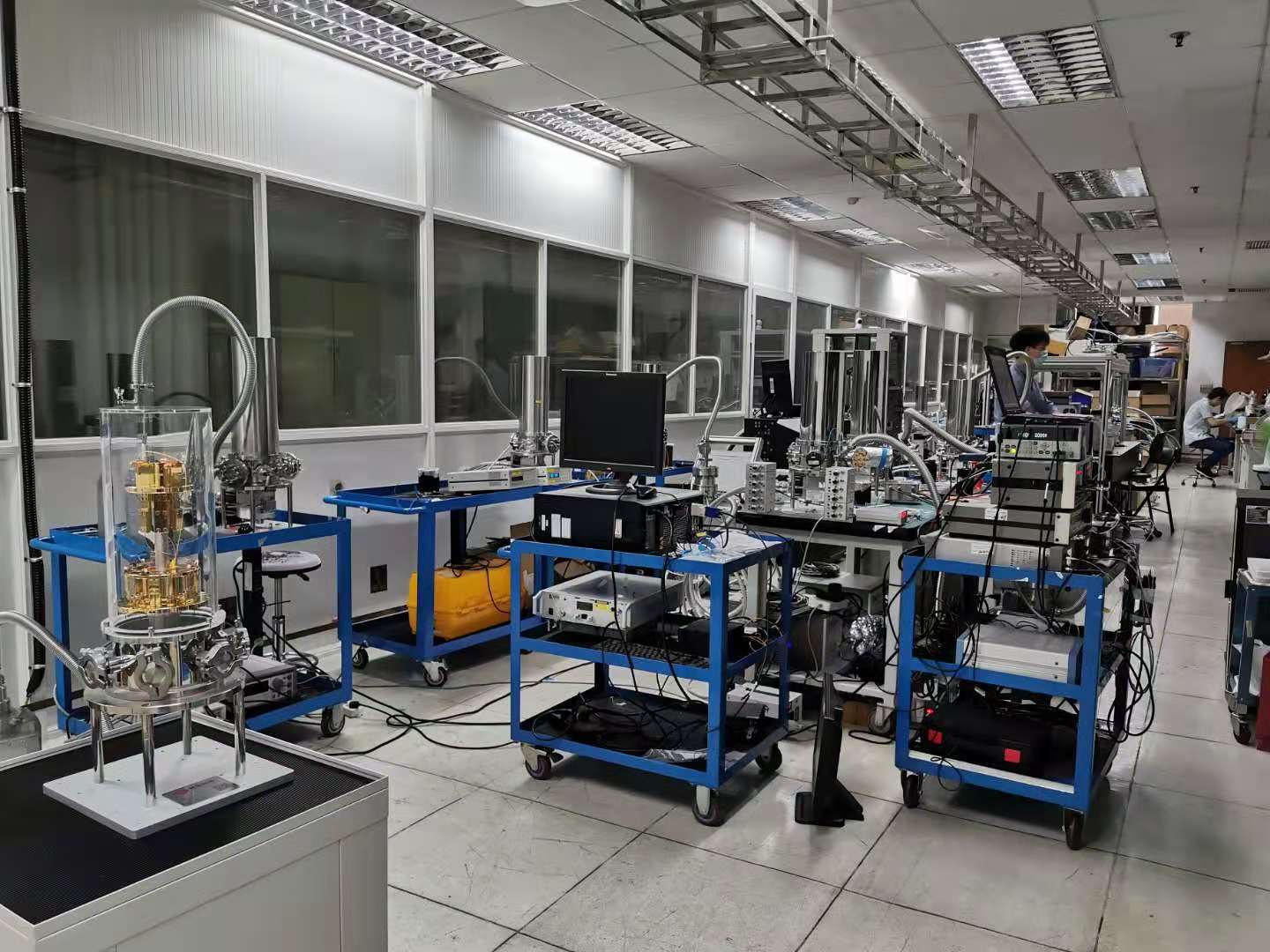 超导单光子探测研究的测试平台,目前具备设备包括:0.3K-300K制冷机多套、电子学测试系统、光谱分析仪、多套可见到近红外波段光源及超连续光源以及超低温空间光耦合探测系统等。平台可提供可见、近红外波段超导纳米线单光子探测器性能表征,如探测效率、时间抖动、暗计数,恢复时间等测量服务。典型测量可实现探测效率测量不确定度<5%;时间抖动测量精度≤1ps等。