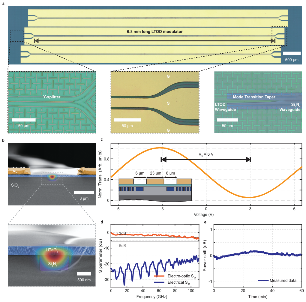 近日,中国科学院上海微系统与信息技术研究所(以下简称“上海微系统所”)欧欣研究员团队联合瑞士洛桑联邦理工学院Tobias J. Kippenberg教授团队和德国卡尔斯鲁厄理工学院Christian Koos教授团队,围绕薄膜钽酸锂(LiTaO3,LT)与氮化硅(Si3N4)光子芯片的晶圆级异质集成开展研究,构建出一种兼具低光学损耗和线性电光(Pockels)调制的新型光电平台。基于该平台,研究团队实现了高效、高速电光调制:调制效率达4.08 V·cm,电光响应3dB 带宽约为100 GHz;并进一步完成高速通信演示:强度调制(IMDD)下净信号传输速率达333 Gbit/s,相干IQ调制净信号传输速率达581 Gbit/s。该工作为现有氮化硅光子平台补齐了长期缺失的高速电光调制能力,也为面向高速互连、RF 光子与模拟信号处理的片上光学系统提供了可大规模化的新工艺路线。相关成果以“Heterogeneously integrated lithium tantalate-on-silicon nitride modulators for high-speed communications”为题发表在国际学术期刊《自然·通信》(Nature Communications)上,上海微系统所为第一单位。